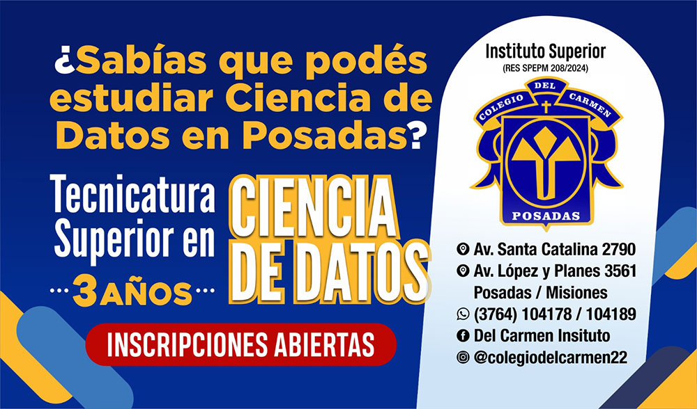 ¿Sabías que en Posadas podés formarte en Ciencia de Datos? El Instituto Superior Colegio del Carmen ofrece la Tecnicatura en Ciencia de Datos, una carrera corta con excelentes oportunidades laborales. Con una modalidad de cursada presencial y una duración de 3 años, obtendrás un título que te permitirá integrarte rápidamente al mundo laboral. ¡Esta es la oportunidad de construir tu futuro con las herramientas necesarias!