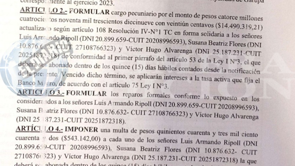 El balance 2023 de la gestión municipal de Garupá fue desaprobado por el Tribunal de Cuentas de la provincia, lo que derivó en una multa económica que, hasta el momento, no tiene claro quién deberá abonar.