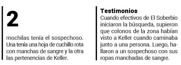 Pero al personal policial le llamó la atención que sus ropas tenían manchas similares a sangre, por lo cual le pidieron si les podía exhibir el contenido de las dos mochilas que transportaba. Una posteriormente fue reconocida como la perteneciente a Keller.