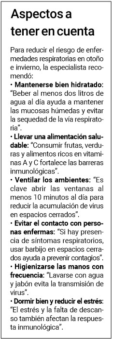 A medida que avanza el otoño, los cambios en la temperatura y la humedad afectan nuestras vías respiratorias. “El aire que ingresa al sistema respiratorio por la nariz es calentado y humedecido, filtrando sustancias dañinas antes de su llegada a los pulmones. Pero si el aire es muy frío y seco, esta función se ve alterada, irritando la vía respiratoria y facilitando la entrada de virus y bacterias”, advirtió Azcona.