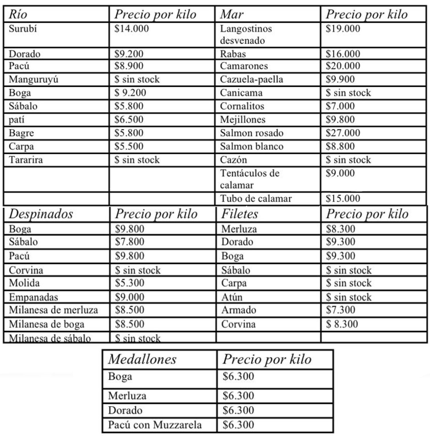 “El dorado está 9200 pesos, el tema es que hay solamente dorado cortado para frito o un filet de dorado sin espina, dorado entero en este momento no está habiendo”, contó. El mismo precio está el sábalo, “pero porque hay poco”, aclaró el pescadero.