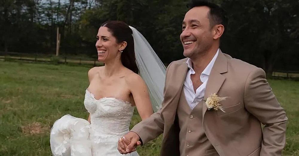 En la primera imagen, que eligió como portada de la publicación, Pereyra y Rezzuto aparecen en escena, corriendo, en un campo abierto, mirando al frente donde estarían los invitados. Vestido con un ambo de color marrón claro y una camisa blanca, el cantante, con su sonrisa característica, disfrutó de principio a fin la velada romántica con su pareja, que eligió un outfit clásico de novia: total white.