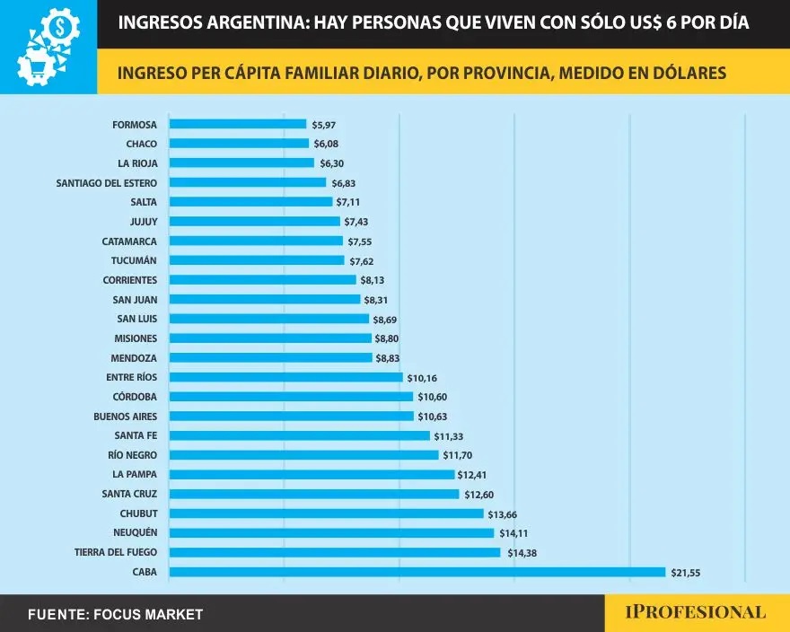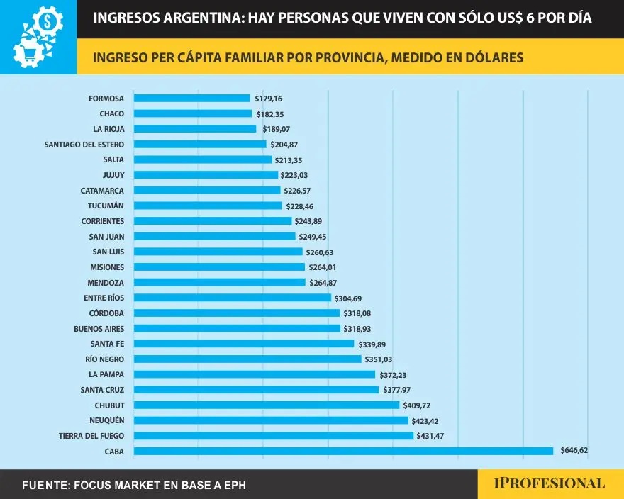 Mientras que en CABA el ingreso per cápita familiar es de US$646, en las provincias ubicadas al Nordeste del país, como Formosa y Chaco, es de apenas US$179 y US$182 respectivamente. De hecho, el distrito del NEA con mejores números es Misiones, con 264,01 dólares mensuales por familia.