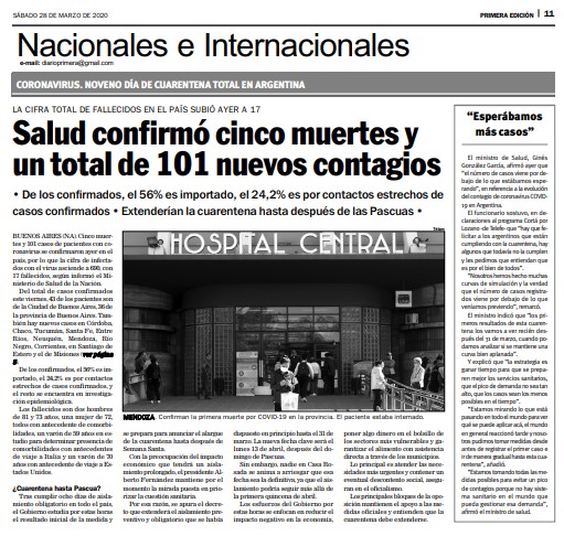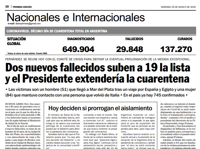 Para entonces, en el país ya se habían sumado otras dos víctimas fatales (19 en total) y los contagiados eran 745, mientras que a nivel mundial las cifras se acercaban dramáticamente a los 30 mil fallecidos.