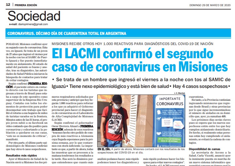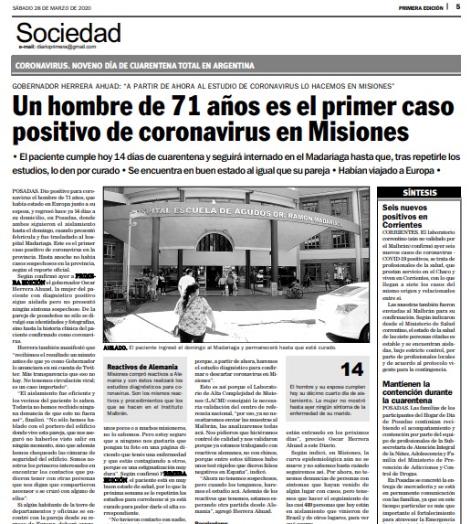La fecha del 27 de marzo de 2020 quedará en la memoria colectiva de Misiones como el día en que se confirmaba el primer caso de SARS CoV2 en la provincia, más de tres meses después de la aparición de la enfermedad en China y a más de una semana de declarada la pandemia y el consiguiente confinamiento en el país.