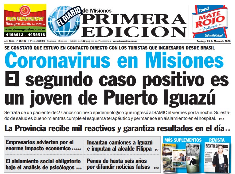Un día después, el 28 de marzo de 2020, se confirmaba un segundo caso de COVID-19 en Misiones, en este caso un joven de 27 años de Puerto Iguazú que, por su trabajo en el sector turístico, había participado en los operativos de emergencia de ingreso y egreso de visitantes y repatriados en la frontera con Brasil. Un contacto estrecho del hombre, familiar directo, se convertiría pocas horas después en el tercer caso confirmado.
