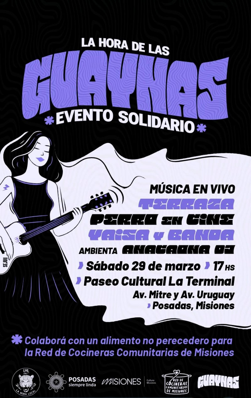 Una vez más, el arte de la mano de la solidaridad se conjugan para brindar nuevas posibiliades. En esta ocasión dos son los objetivos del evento organizado por La Hora de las Guaynas: principalmente, recaudar alimentos e insumos para la Red de Cocineras Comunitarias de Misiones, y también visibilizar proyectos musicales y bandas que tienen como protagonistas a mujeres.