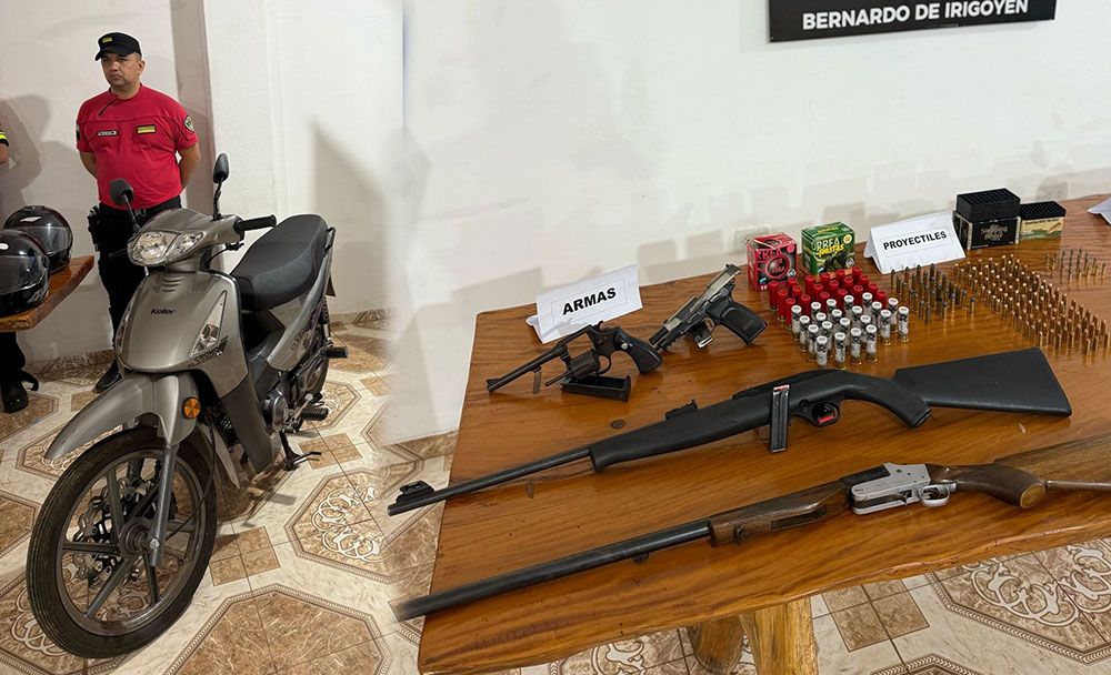 Los elementos incautados en los domicilios allanados son un rifle calibre .22, una escopeta calibre 16, un revólver calibre .38, una pistola 9 milímetros; (39) cartuchos calibre 16; (36) cartuchos 9 mm punta hueca; (26) cartuchos 9 mm punta encamisada y (27) cartuchos completos calibre .38, una camioneta Hilux, una moto de 110 cc, cascos, cuatro teléfonos celulares, una computadora y cinco cámaras de seguridad. Todo fue depositado en sede policial para las pericias correspondientes.