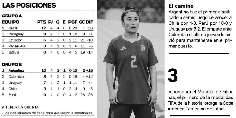 La Selección argentina femenina de futsal, con la misionera Cecilia López entre sus filas, disputará hoy desde las 13.30 la semifinal del certamen ante Paraguay, en busca de meterse en la final y asegurar uno de los tres cupos disponibles para el primer Mundial FIFA de la modalidad.