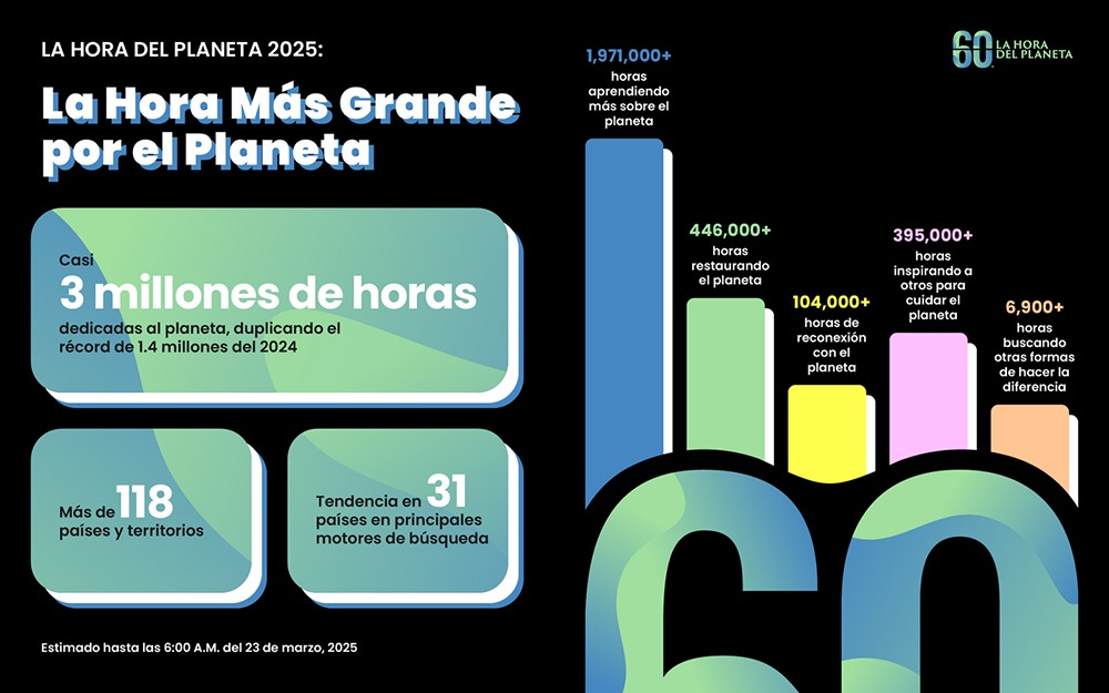 De esta manera, cerca de 3 millones de horas fueron dedicadas a nuestro planeta por personas en más de 118 países y territorios, de los cuales en más de 31 países fue tendencia el movimiento, convirtiendo a La Hora del Planeta de este año en la más grande hasta la fecha.