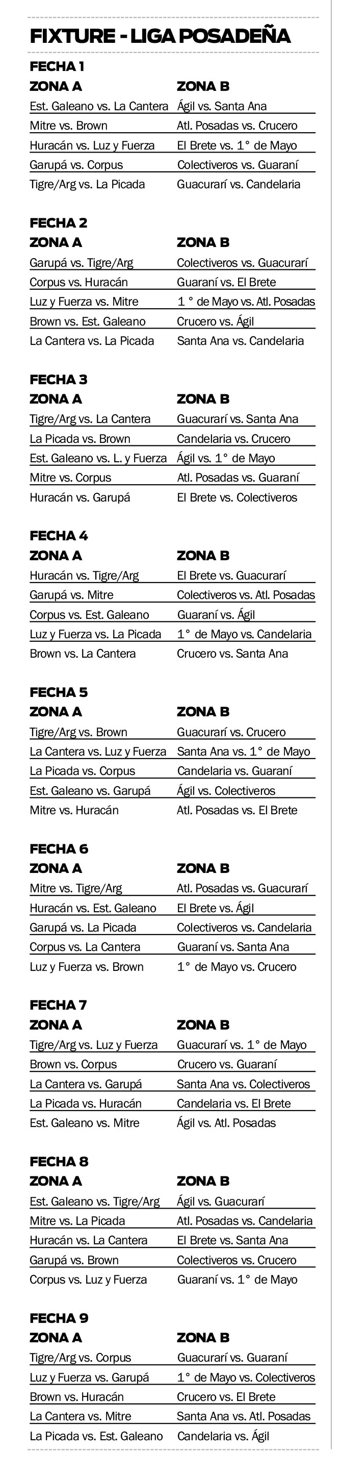 La Liga Posadeña de Fútbol (LPF) dio a conocer horas atrás el fixture del Torneo Apertura 2025, que comenzará el sábado 5 de abril. A la espera de la resolución del Tribunal de Disciplina sobre el último ascenso -entre Tigre y Argentinos- , se confirmó que habrás diez partidos por jornada, incluidos los interzonales.