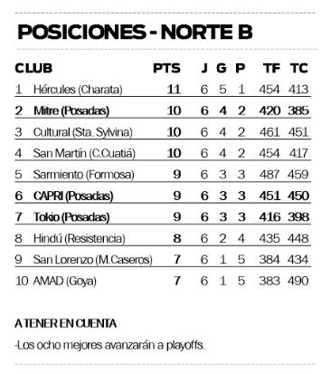 CAPRI venía de un triunfazo en Goya ante AMAD, por 83-73, por lo que llega motivado para el duelo entre posadeños a disputarse mañana. Y es que desde las 21, en Jujuy y La Rioja, chocará con Bartolomé Mitre, que marcha segundo en la tabla de posiciones de la Conferencia Norte B.