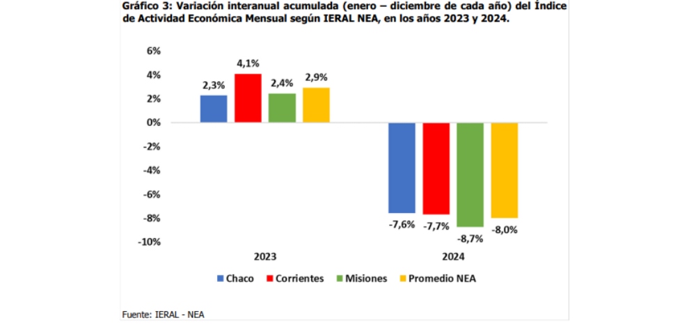 Precisa entonces: “Es así que, si se compara el mes de abril del 2024 respecto al mes de diciembre del 2023, se observa que, producto del ajuste a nivel nacional, en Misiones la caída en el nivel de actividad rondó el -5,8%; mientras que en Chaco la caída fue del -9,1%, y en Corrientes alcanzó el -9,9%”.