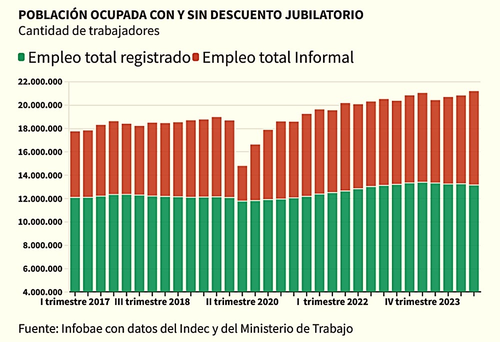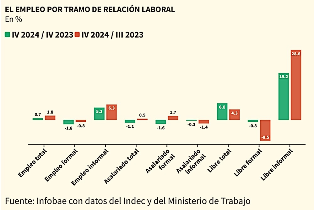 El desagregado del empleo que surge de cotejar los datos de la Encuesta Permanente de Hogares del INDEC -proyectado al total país- con el relevamiento de la Secretaría de Empleo del Ministerio de Trabajo, basado en el Sistema Integrado Previsional Argentino (SIPA), muestra que mientras el empleo total registrado disminuyó en 2024 en 234.100 personas en el segmento informal (sin descuento jubilatorio) aumentó en 387.300, arrojando un resultado neto expansivo en 153.200 puestos.