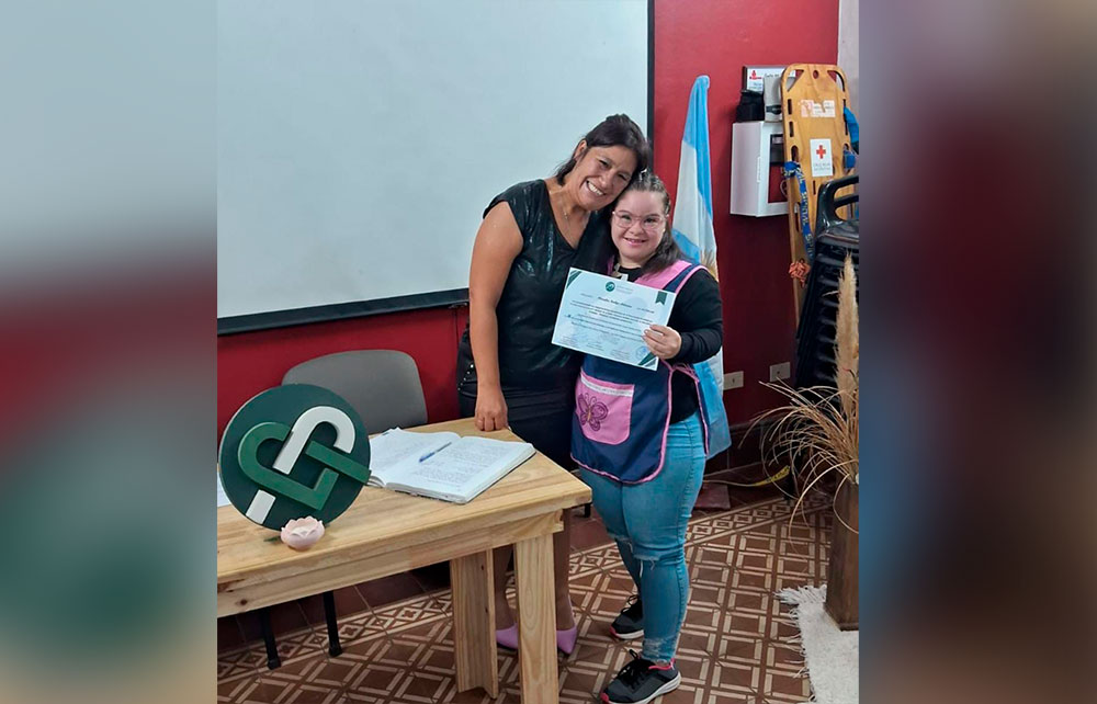 En marzo de este año, Evelyn Morales recibió su título tras completar su formación como Auxiliar Materno Infantil en la Academia Vínculos de Posadas. A lo largo de este proceso, contó con el acompañamiento de una psicopedagoga y una acompañante terapéutica, aunque dentro del aula se destacó por su autonomía. “Todo el año se manejó sola para ir a clase. No tuvo maestra integradora, sino que ella misma se integró a la clase y con sus compañeras”, contó su madre, Jennifer, en diálogo con PRIMERA EDICIÓN.