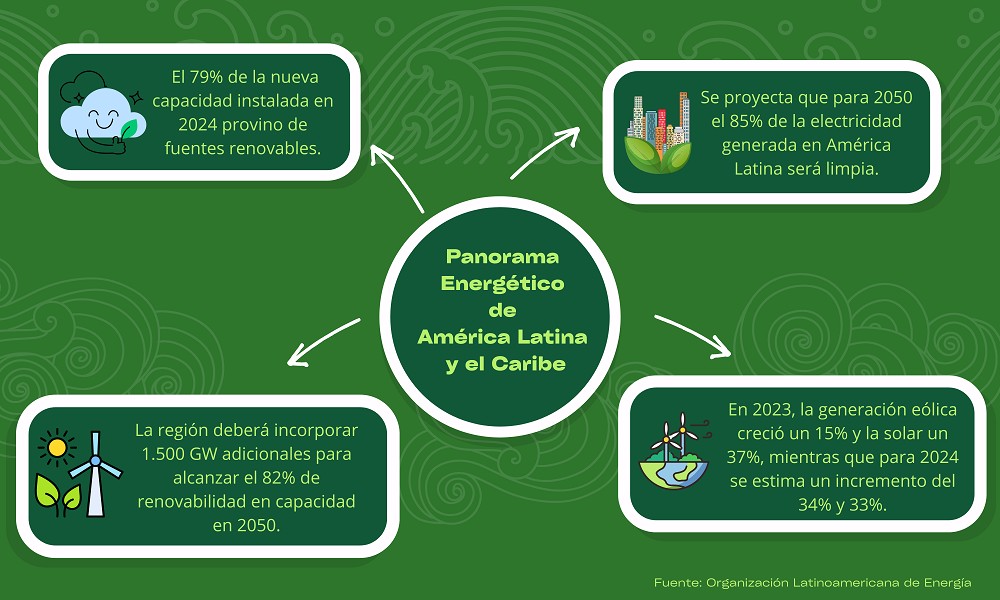 Cabe destacar que el informe Panorama Energético de América Latina y el Caribe 2024, publicado por la Organización Latinoamericana de Energía (OLADE), proyecta que la región deberá incorporar 1.500 GW adicionales para alcanzar el 82% de renovabilidad en capacidad en 2050.