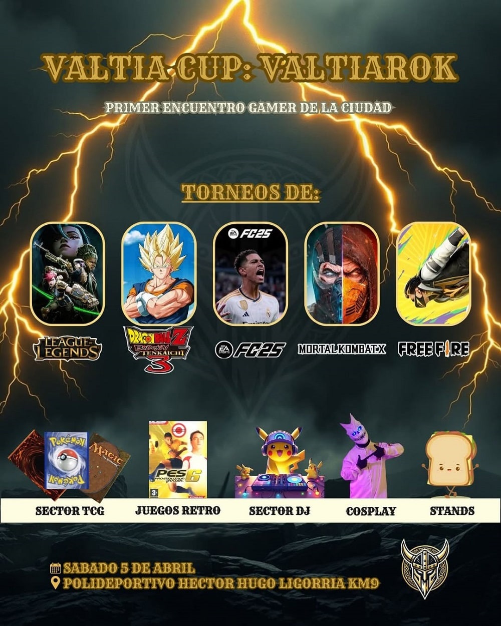 El sábado de 17 a 22 horas, se realizará Valtiarok, un evento reúne lo mejor del gaming, cosplay, música y cultura geek en el Polideportivo Km9, Héctor Hugo Ligorria, de Eldorado. Además habrá Torneos de videojuegos, Sector TCG, DJ en vivo, Exhibición de cosplay, Juegos retro, Stands y tiendas, patio de comidas, coleccionables y mucho más. Entrada libre.