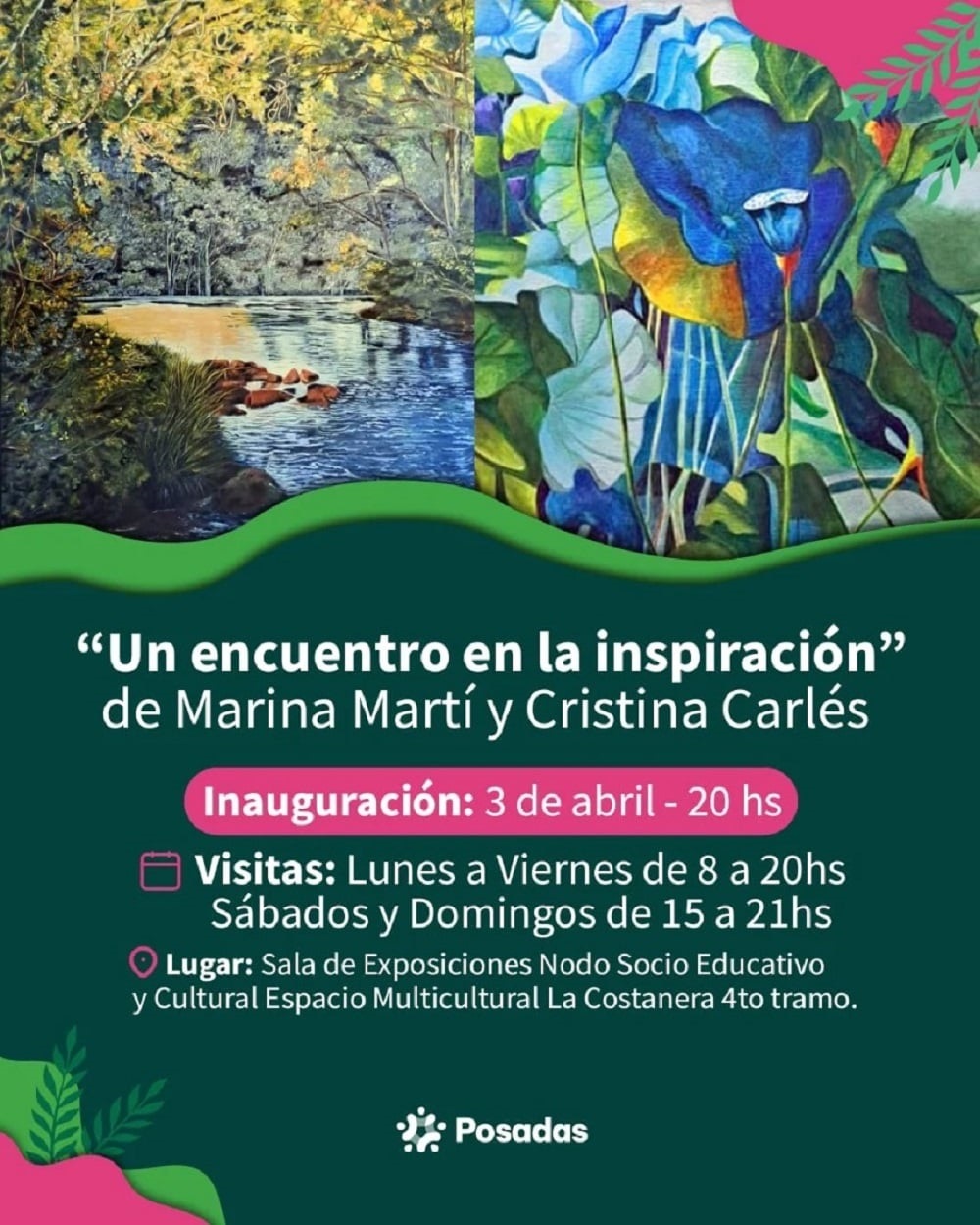 Las Artistas Marina Marti y Cristina Carlés presentan una muestra colectiva que nos sensibiliza para dar a luz lo que habla el alma a través del pincel. La misma se podrá visitar de lunes a viernes de 8 a 20 y sábados y domingos de 15 a 21 horas en la sala de exposiciones Nodo Socio Educativo y Cultural Multicultural de la Costanera. Entrada libre.