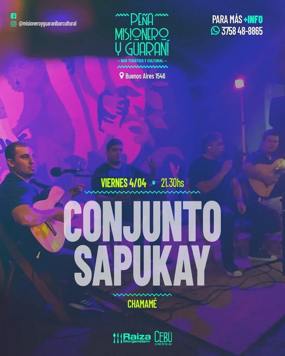 El conjunto Sapukay se presenta este viernes, a las 21.30 horas, en el espacio de Buenos Aires al 1560), de Posadas, para un encuentro con lo más profundo de las raíces regionales de la música. Consultas y reservas al 3758 488865.