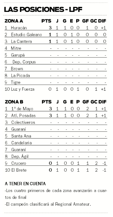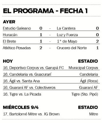 El Torneo Apertura tuvo ayer su puntapié inicial con cuatro partidos. Festejaron Huracán, 1º de Mayo, Atlético Posadas y además hubo empate entre Estudio Galeano y La Cantera. Hoy hay 5 partidos en cartelera.