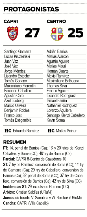 Centro, por su parte, sumó su segunda caída en el final (venía de perder por 31-27 ante Tacurú) y en ambos casos por escasa diferencia.