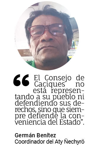 Desde el sector disidente, Germán Benítez, cacique de la tekoa Tunaí y uno de los coordinadores del Aty Ñechyrõ, sostuvo: “Hasta ahora nosotros no entendemos qué está pasando. Sabemos que la Dirección de Asuntos Guaraníes está hace más de 35 años y es un organismo del Estado que está especialmente para asistir y actuar en relación a las problemáticas indígenas, pero no vemos que exista una verdadera preocupación. Hay muchas cosas para trabajar juntos, para que tengamos una real participación”.