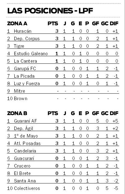 Los otros dos punteros son Huracán y Deportivo Corpus, que ayer superó a Garupá FC por 2-1. La primera fecha se completará este miércoles desde las 17 en Rocamora, cuando por ese mismo grupo Bartolomé Mitre se presente ante Jorge Gibson Brown.