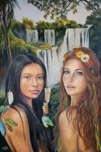 Teniendo en cuenta el crisol de razas de nuestra tierra busqué presentarlas en su esencia más pura y bella. Reivindicando conceptos como belleza natural, igualdad, amistad sin fronteras, herencia cultural, valorización de nuestros orígenes. Además busqué darle un toque de naturalidad con la sensación de que ellas observaban las majestuosas Cataratas del Iguazú y se voltean para la “foto” que en este caso sería mi pincel el que haría el “disparo” de la cámara.