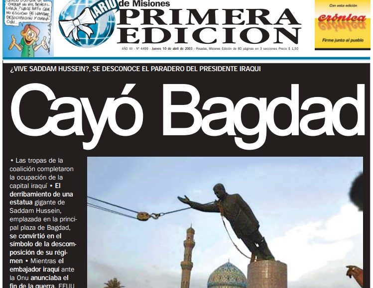 Las tropas de la coalición estadounidense-inglesa llegaron a Bagdad, la capital de Irak, el 9 de abril de 2003. Así caía definitivamente el régimen del dictador Saddam Hussein, quien había gobernado el país durante 24 años. Como hecho más simbólico de ese momento, manifestantes destruyeron una gran estatua de Hussein que estaba en una plaza central de la capital iraquí.