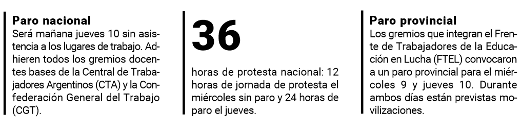 El FTEL convocó a un paro de 48 horas para el miércoles 9 y jueves 10 de abril. El miércoles está prevista una movilización provincial a la altura de la estación de servicio de la YPF de Jardín América, a partir de las 8, que podría avanzar en un corte de la ruta nacional 12, tal como ocurrió la semana pasada cuando los educadores interrumpieron el tránsito durante una hora. En jueves, en tanto, las organizaciones de docentes en actividad y jubilados que integran el FTEL tienen previsto una concentración en Posadas, en avenidas Urquiza y Corrientes, a partir de las 8 para marchar hacia el Consejo General de Educación (CGE).