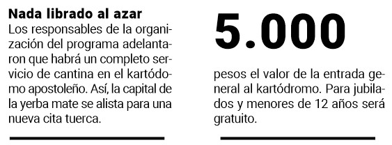 Además, los responsables de organizar el programa adelantaron que habrá un completo servicio de cantina en el kartódomo apostoleño, por lo que se espera una fiesta completa durante el fin de semana.