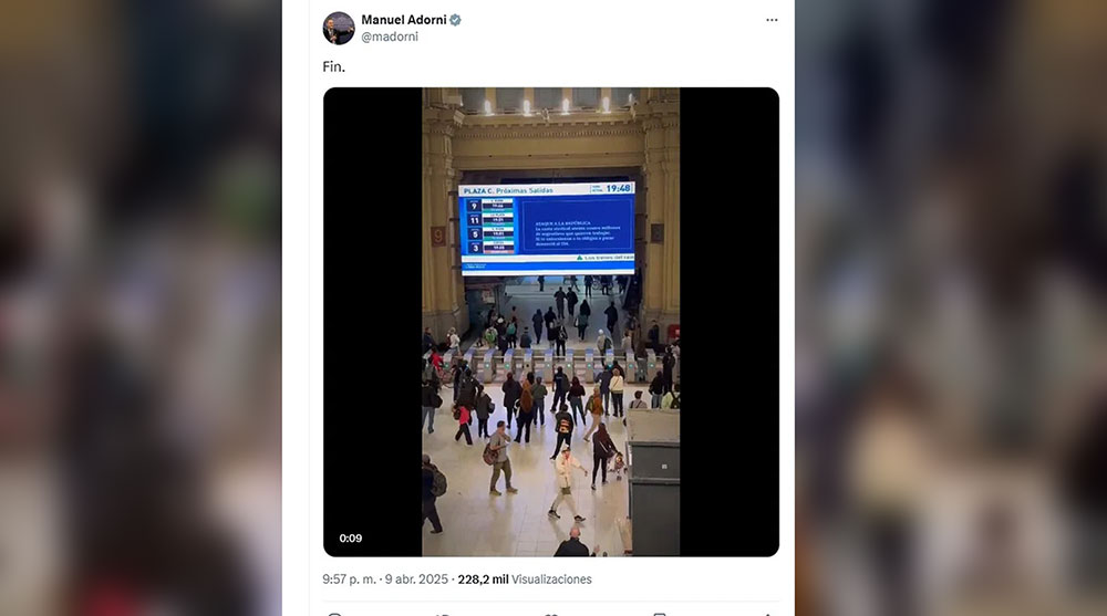 El video, difundido desde la tarde del miércoles, muestra una placa con la leyenda: “La casta sindical atenta contra millones de argentinos que quieren trabajar. Si te extorsionan o te obligan a parar, denunciá al 134”, acompañado del mensaje del vocero presidencial Manuel Adorni en redes sociales, quien lo compartió con su habitual cierre: “Fin”.