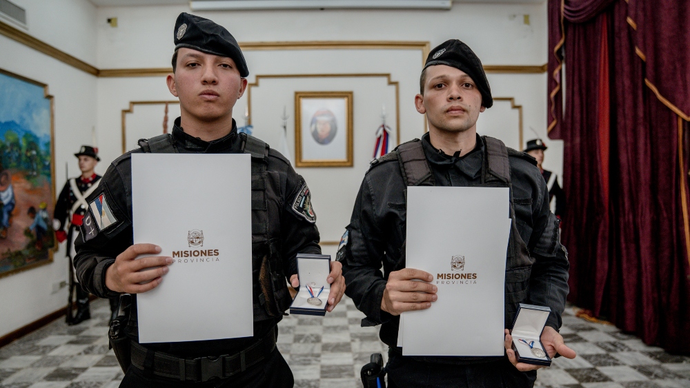 El gobernador Hugo Passalacqua encabezó este jueves el acto de entrega de la Medalla al Mérito “General Don Andrés Guacurarí y Artigas” a los agentes de la División Motorizada, Héctor Manuel Piñeyro y Enrique Fernando Ramírez, quienes salvaron a una mujer en el barrio Itaembé Guazú de Posadas.