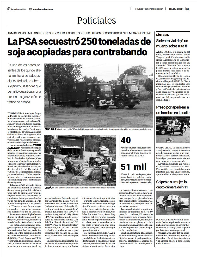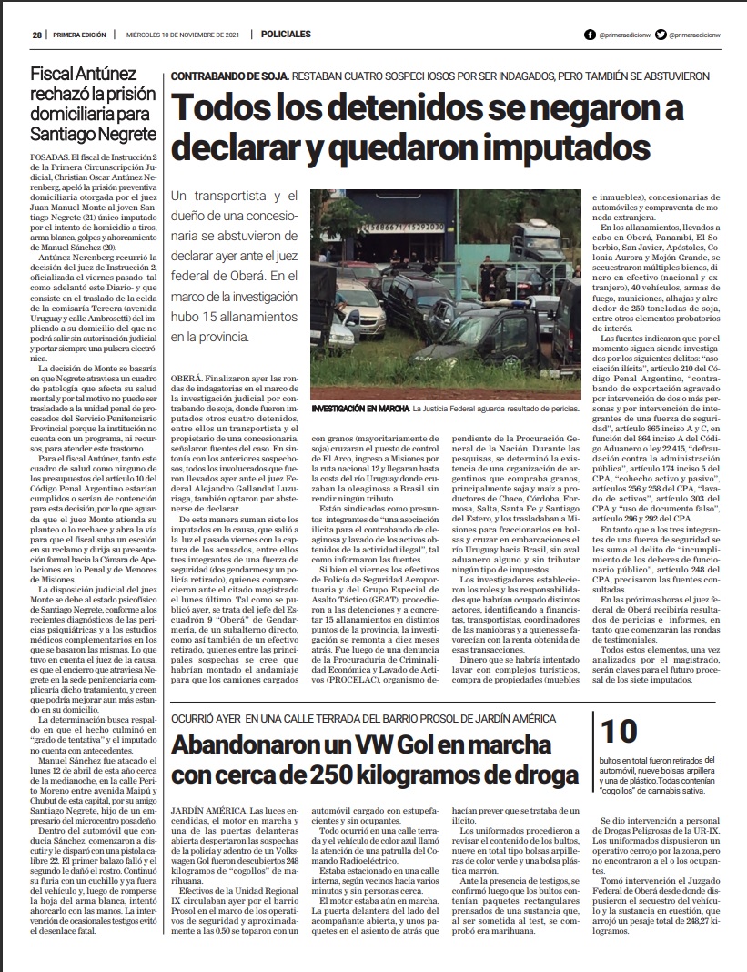 Los encartados que llegan a debate están acusados de haber formado parte de una asociación ilícita, dedicada a concretar el traslado de granos desde Santiago del Estero, Chaco y otras provincias, hacia Misiones, con la finalidad de exportarlas de contrabando por pasos no habilitados hacia Brasil.