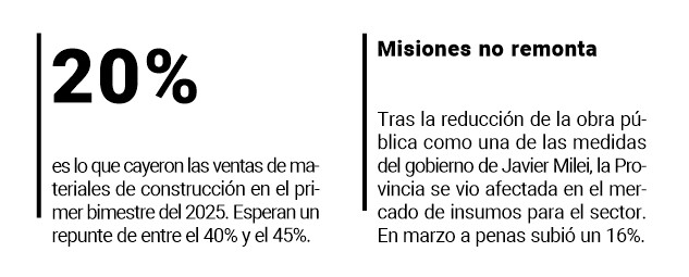 Desde noviembre del 2024 y el primer bimestre (enero y febrero) del 2025, las ventas de insumos para la construcción cayeron un 20%. En Misiones, el sector no logra repuntar de este retroceso, pese a que en marzo hubo un leve repunte. La merma se debe a medidas del Gobierno nacional que ralentizaron y detuvieron los nuevos proyectos, especialmente aquellos con financiación de la Nación.