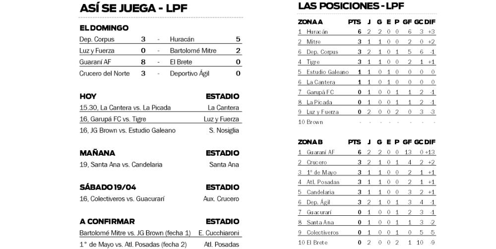 Recordemos que la actividad de esta fecha se puso en marcha el pasado domingo con la disputa de cuatro partidos. Guaraní Antonio Franco goleó por 8-0 a El Brete en Villa Sarita, Huracán se impuso en condición de visitante por 5-3 a Deportivo Corpus, Bartolomé Mitre tuvo un estreno victorioso (2-0) ante Luz y Fuerza y Crucero del Norte superó por un claro 3-0 a Ágil de Gobernador Roca.