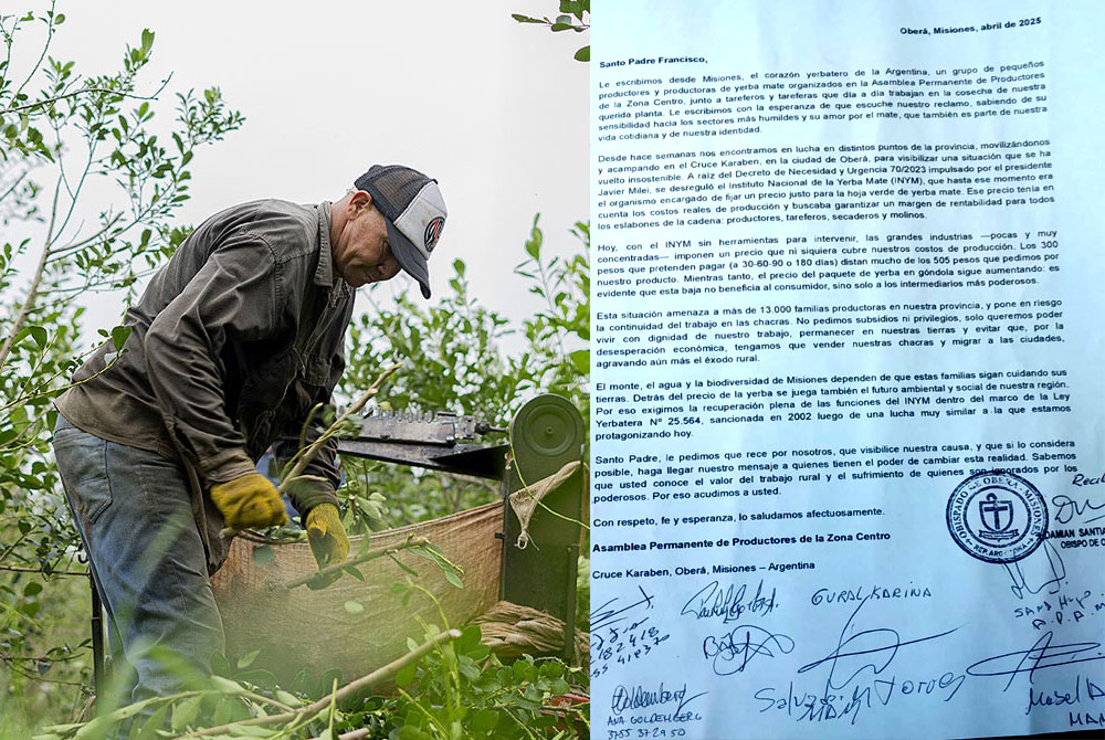 En una carta enviada al papa Francisco, un grupo de pequeños productores de yerba mate de la zona Centro de Misiones, a través del Obispado de Oberá, solicitó la intervención del Sumo Pontífice ante la grave crisis que atraviesa el sector como consecuencia de la desregulación del Instituto Nacional de la Yerba Mate (INYM) impuesta por el Gobierno nacional.