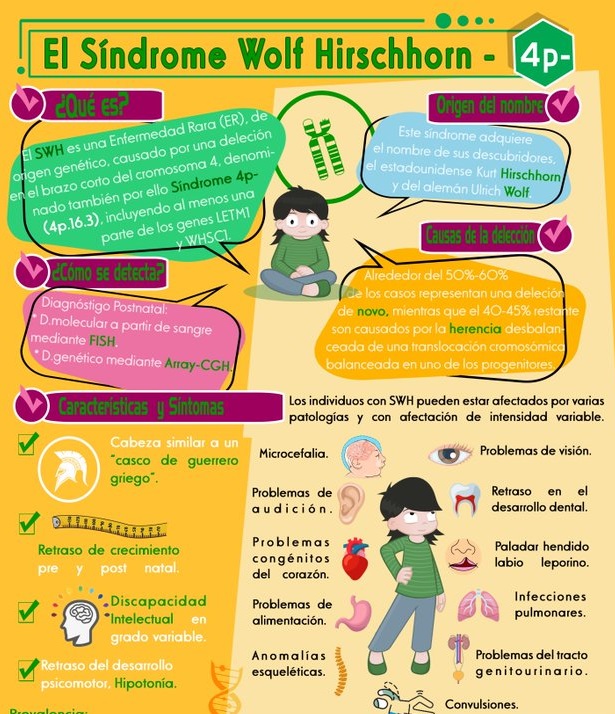 El 16 de abril es el Día Internacional del Síndrome de Wolf-Hirschhorn, una fecha que se conmemora desde 2014 por asociaciones de pacientes de todo el mundo con el objetivo de informar y concienciar a la población sobre esta enfermedad genética rara causada por la pérdida de un fragmento del brazo corto del cromosoma 4 (4p). Esta pérdida puede ocurrir de manera espontánea o ser heredada de uno de los padres que también puede ser portador del síndrome. Ttiene una prevalencia de 1 por cada 50 mil nacimientos, el doble de mujeres que hombres.