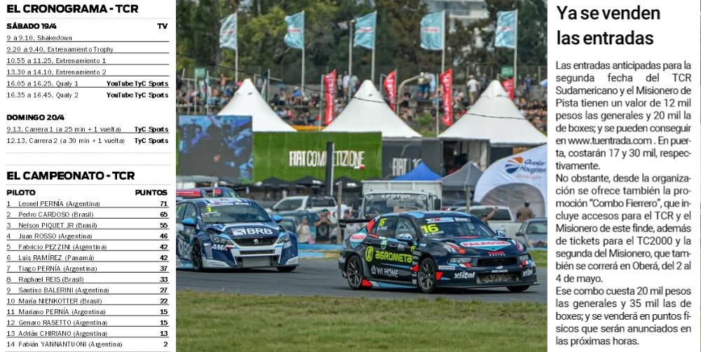 Un finde para alquilar balcones se vivirá este fin de semana en Oberá, con el debut en suelo misionero del TCR Sudamericano, que correrá en simultáneo con la primera fecha del Campeonato Misionero de Automovilismo en Pista.