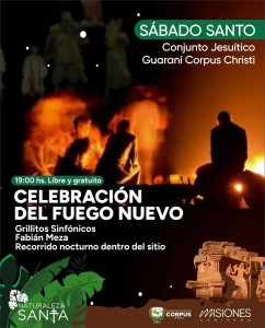 Corpus: Desde las 18.30 hs, el Conjunto Jesuítico de Corpus será sede de la Celebración del Fuego Nuevo, una experiencia inmersiva que combina música, senderos iluminados con velas y escenas teatrales en medio de la selva. Participan los Grillitos Sinfónicos, Fabián Meza y el Trío Da Capo. Entrada libre.