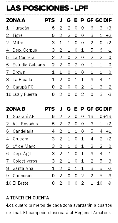 Así, Atlético Posadas comparte la cima de la Zona B juntos Guaraní Antonio Franco, aunque estos están primeros ya que tienen mejor diferencia de gol (+13 contra los +2 que acumula el Deca).