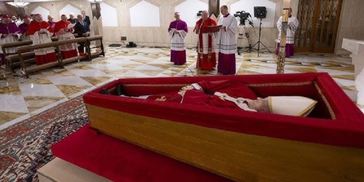 El féretro de madera abierto fue llevado en procesión desde la capilla de Santa Marta.Los portadores del ataúd caminaron seguidos por los cardenales vestidos con sotanas color rojo, obispos con túnicas violetas y los guardias suizos con sus típicos uniformes dorados y azules.