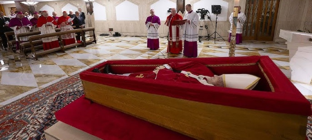 El féretro de madera abierto fue llevado en procesión desde la capilla de Santa Marta.Los portadores del ataúd caminaron seguidos por los cardenales vestidos con sotanas color rojo, obispos con túnicas violetas y los guardias suizos con sus típicos uniformes dorados y azules.
