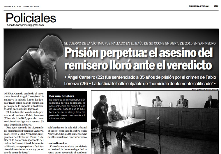 Uno de ellos era Daniel Ángel Carneiro, quien el lunes 2 de octubre de 2017 -dos años y medio después del crimen- era condenado por el Tribunal Penal 1 de Oberá a 35 años de prisión efectiva, el castigo más duro que preveía la ley por el delito de “homicidio doblemente calificado para perpetrar o facilitar otro delito (criminis causa) y por el uso de arma de fuego”.