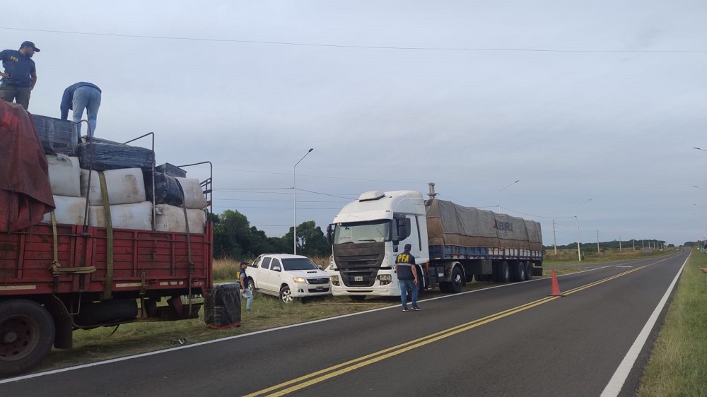 Allí detuvieron la marcha de dos camiones con sus respectivos semirremolques perteneciente a una empresa de transporte de encomiendas y, al momento de verificar sus cargas, divisaron grandes cantidades de paquetes cuyas características (entre ellas el tamaño, volumen y envoltorio) eran muy similares a los comúnmente utilizados para este tipo de delitos.