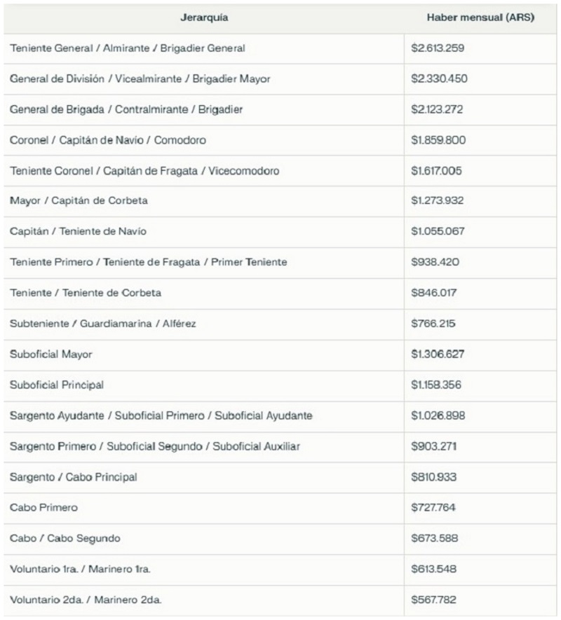 En las Fuerzas Armadas, los sueldos oscilaban entre $553.302 y $2.546.616, dependiendo de la jerarquía. Con la actualización, los haberes para la Policía de Establecimientos Navales ahora varían entre $313.364 y $805.567, y para el personal militar entre $567.782 y $2.613.259, reflejando un incremento cercano al 8%.