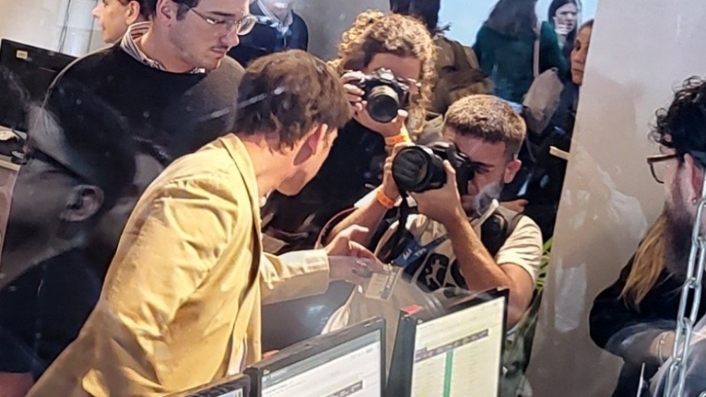Imágenes del momento en que Santiago Caputo miraba y le sacaba foto, de manera muy intimidante, a la credencial del fotorreportero Antonio Becerra al ingreso del debate porteño.