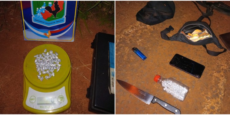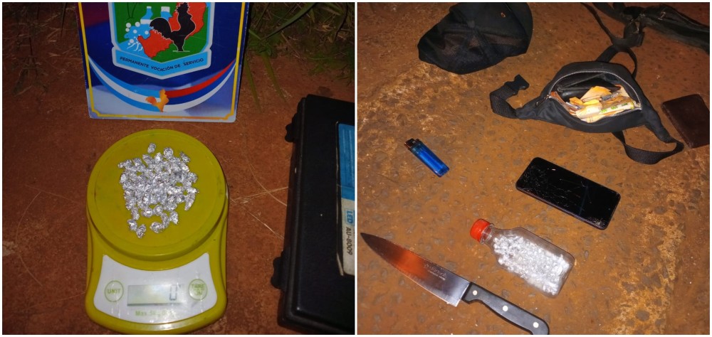 Durante la requisa, se encontraron dos riñoneras en posesión de uno de los detenidos que contenían 61 envoltorios de clorhidrato de cocaína tipo “pedra”, además de 130.000 pesos en efectivo, un cuchillo de cocina, un teléfono celular y una botella plástica.