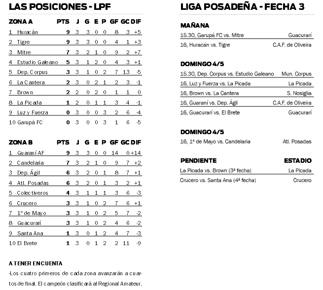 Apenas finalizado el tercer episodio, la Liga Posadeña de Fútbol no perdió tiempo y programó la cuarta fecha del Torneo Apertura, que se pondrá en marcha mañana, con el desarrollo de dos encuentros. Sin dudas el plato fuerte de la jornada estará en el estadio Clemente Argentino Fernández de Oliveira de Villa Sarita. Allí hace las veces de local Huracán, que recibirá a Tigre de Santo Pipó a partir de las 16. Así es, habrá duelo de punteros de la Zona A.
