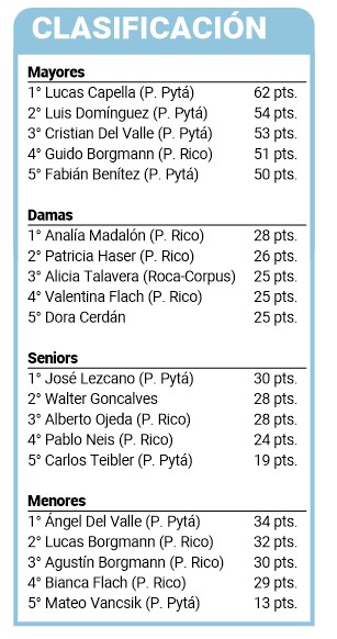 Capella se consagró con 62 puntos, ocho más que Luis Domínguez, su escolta. En la categoría damas, el triunfo fue para Analía Madalón, de Puerto Rico; y entre los experimentados seniors el ganador fue José Lezcano, también del Pira Pytá. En el semillero, el trofeo mayor también fue para un pescador de Posadas: Ángel Del Valle.